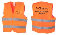 Art. SIP-8519538546In Coronazeiten bedeutet Abstand Sicherheit für uns alle. Weste mit Aufdruck „2 Meter Distanz halten“. Diese Sicherheitsweste unterstützt die Empfehlungen und Vorgaben zur Distanz-Einhaltung von 2 Metern während der bestehenden Corona-Krise. Der Druck kann auf die Brust und auf den Rücken vorgenommen werden. Auch ein individueller Druck mit Ihrem Text, Motiv, Logo kann 1-farbig vorgenommen werden. Sinnvoller Einsatz an Brennpunkten, wo die Einhaltung des Social Distancing aufgezeigt und erinnert werden soll. Für Lebensmittelgeschäfte, im Transportbereich, im Sanitäts- und Gesundheitswesen, im Transportbereich in Spitälern oder für den Zivilschutz, für Polizei, Militär oder für die Feuerwehr. Die Sicherheitsweste mit dem Hinweis zur Abstandswahrung erinnert offensichtlich und plakativ, zeigt freundlich die Distanz-Regel und Social-Distancing-Empfehlung auf. Die Weste entspricht der EU-Verordnung 2016/425/EU-Persönliche Schutzausrüstung Kategorie II. EN ISO 20471:2013+A1:2016. Fluo-Hintergrund und reflektierendes Band. Der Druck ist 1-farbig schwarz auf den orangenen oder gelben Grund empfohlen. Einheitsgrösse für Personen zwischen 165-180 cm.