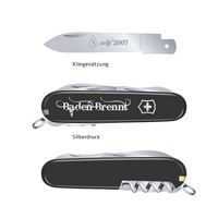 Werkzeuge: grosse Klinge, kleine Klinge, Dosenöffner, Schraubendreher 3 mm, Kapselheber, Schraubendreher 6 mm, Drahtabisolierer, Stech-Bohr-Nähahle, Korkenzieher, Schere, Holzsäge, Mehrzweckhaken, Zahnstocher, Pinzette, Ring